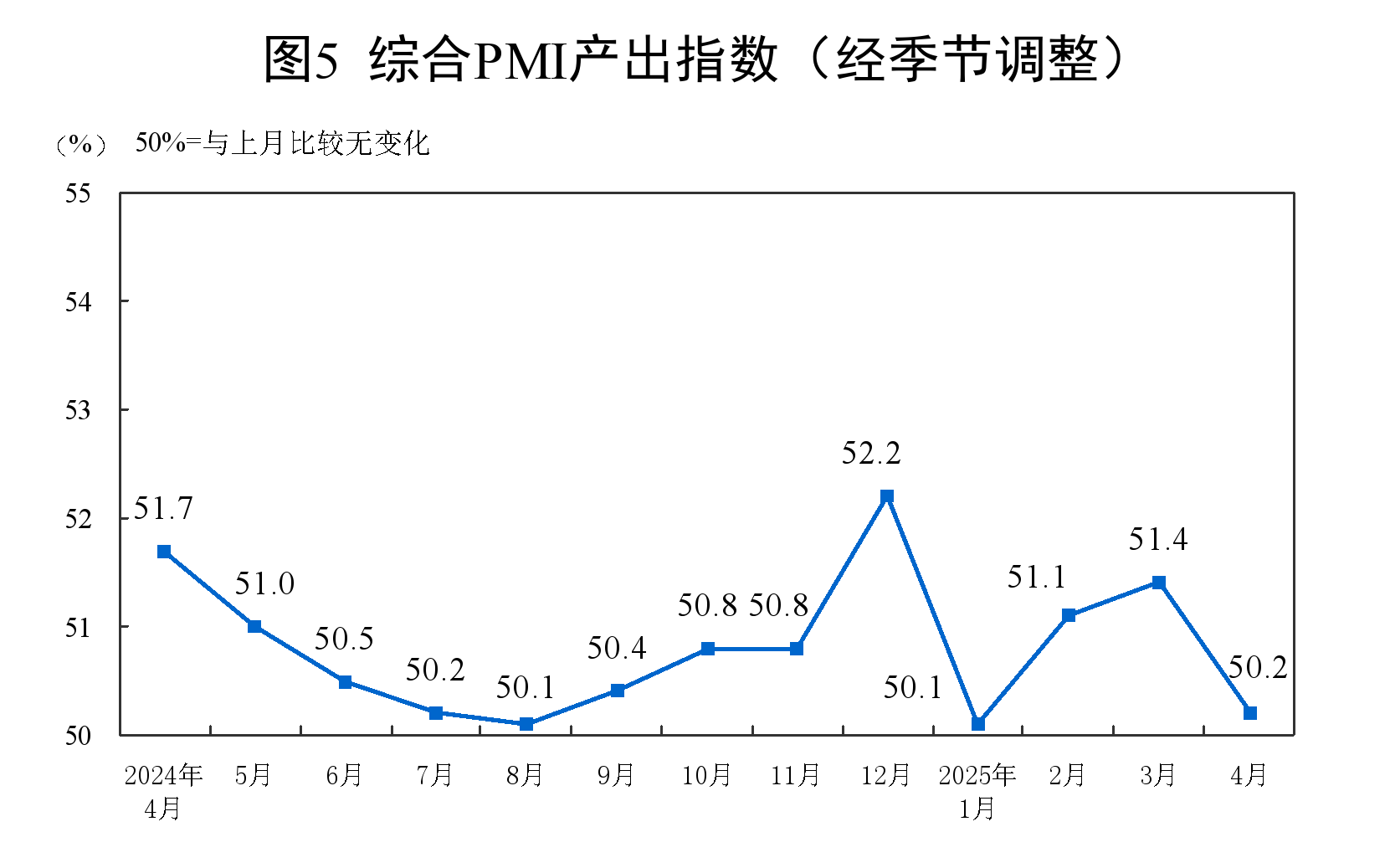 4月份,综合PMI产出指数为50.2%,比上月下降1.2个百分点,继续高于临界点,表明我国企业生产经营活动保持扩张。
