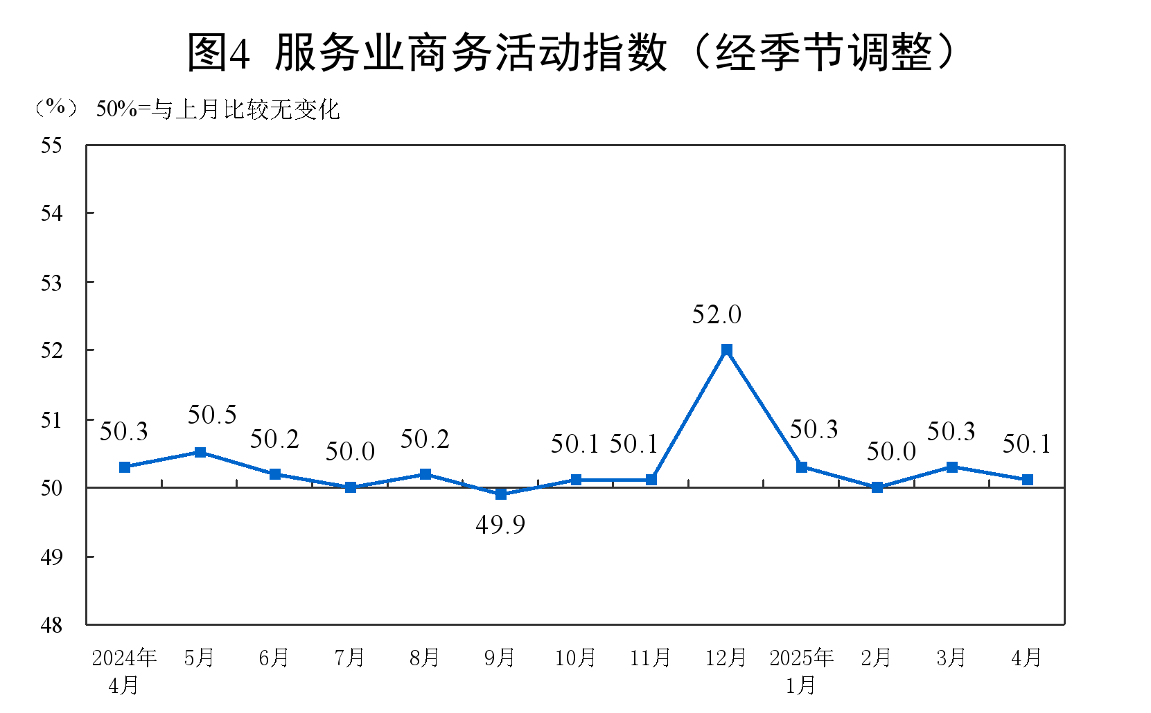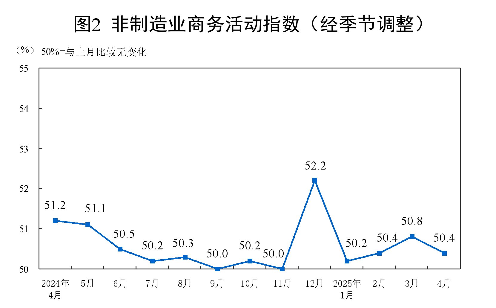 4月份,非制造业商务活动指数为50.4%,比上月下降0.4个百分点,仍高于临界点,非制造业继续保持扩张。